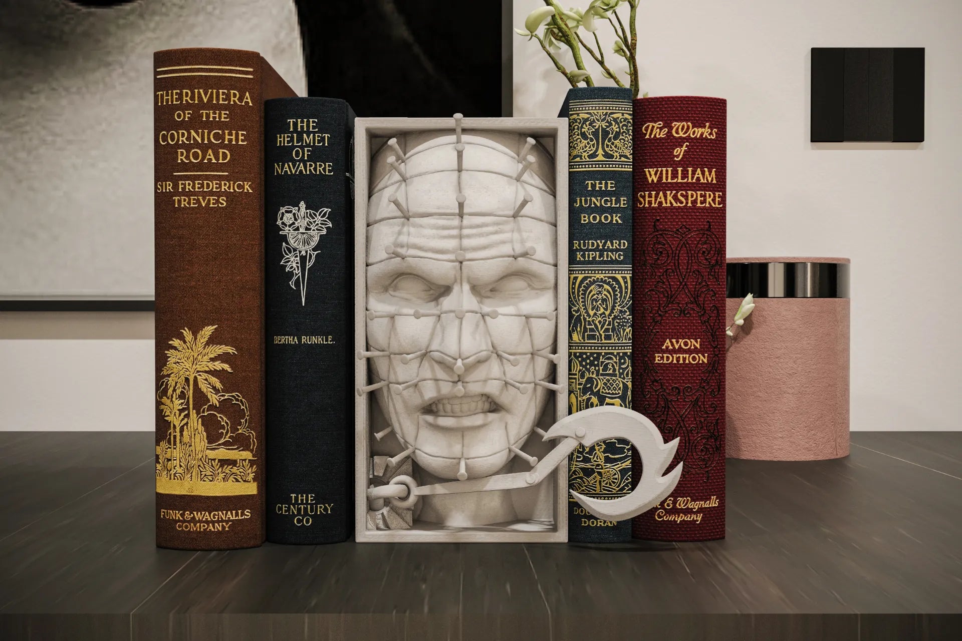 Create a chilling atmosphere in your bookshelf with our Pinhead Book Nook. Inspired by the infamous character from “Hellraiser”, this divider adds a touch of horror to your literature collection. Perfect for horror fans and bookworms alike, it’s the perfect conversation starter for your home.